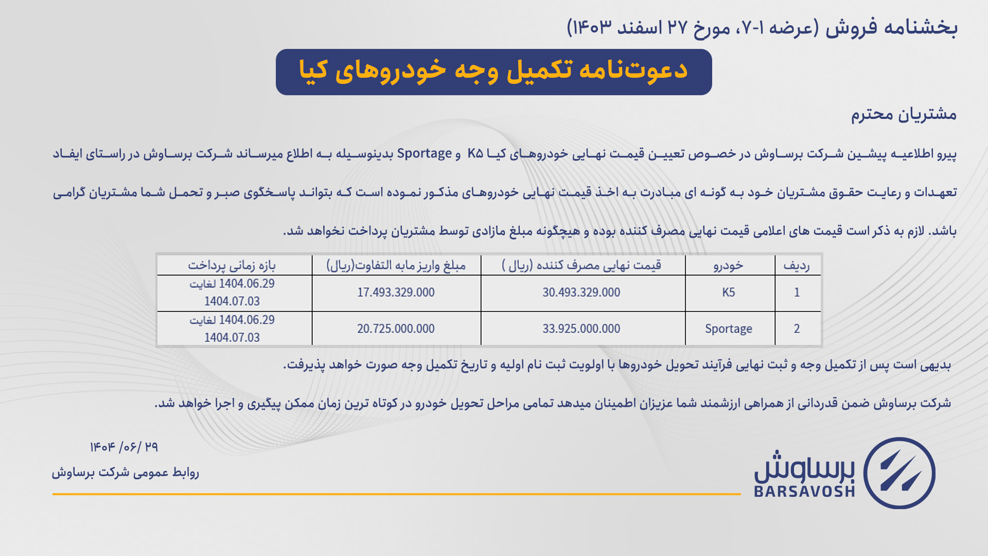 همراهان شرکت برساوش ضمن سپاسگزاری از شکیبایی جامعه مشتریان گرامی شرکت برساوش تجارت نیک در خصوص تاخیر در تحویل خودروهای کرولا کراس، به استحضار میرساند شرکت برساوش همواره متعهد به ایفای تعهدات خود در راستای ارتقای رضایتمندی مشتریان خود بوده لیکن وقوع رخدادهایی که خارج از اراده و کنترل این